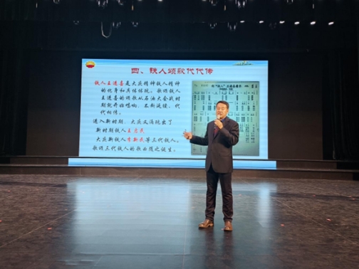 王永桦教授以“大庆精神铁人精神的孕育与传承”为主线,通过激情燃烧大荒原、“诗人·歌者”王进喜、时代之歌:我为祖国献石油、铁人颂歌代代传四个篇章,为学子们铺展了一幅中国石油工业的奋斗长卷。